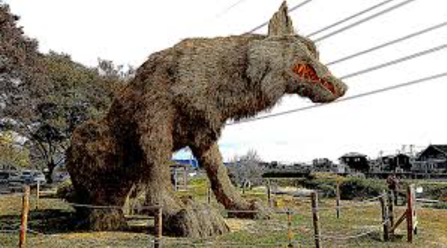 わらかがしは昔から農作物を守る守り神のような存在として作られてきましたが、この巨大わらかがしはその役割を現代風に表現したもので、地域の自然や農業文化への感謝が込められています。 高さ数メートルにも及ぶ迫力ある「山犬」の姿は見る者を圧倒し、訪れる人に地域の歴史と親交の深さを伝えています。
